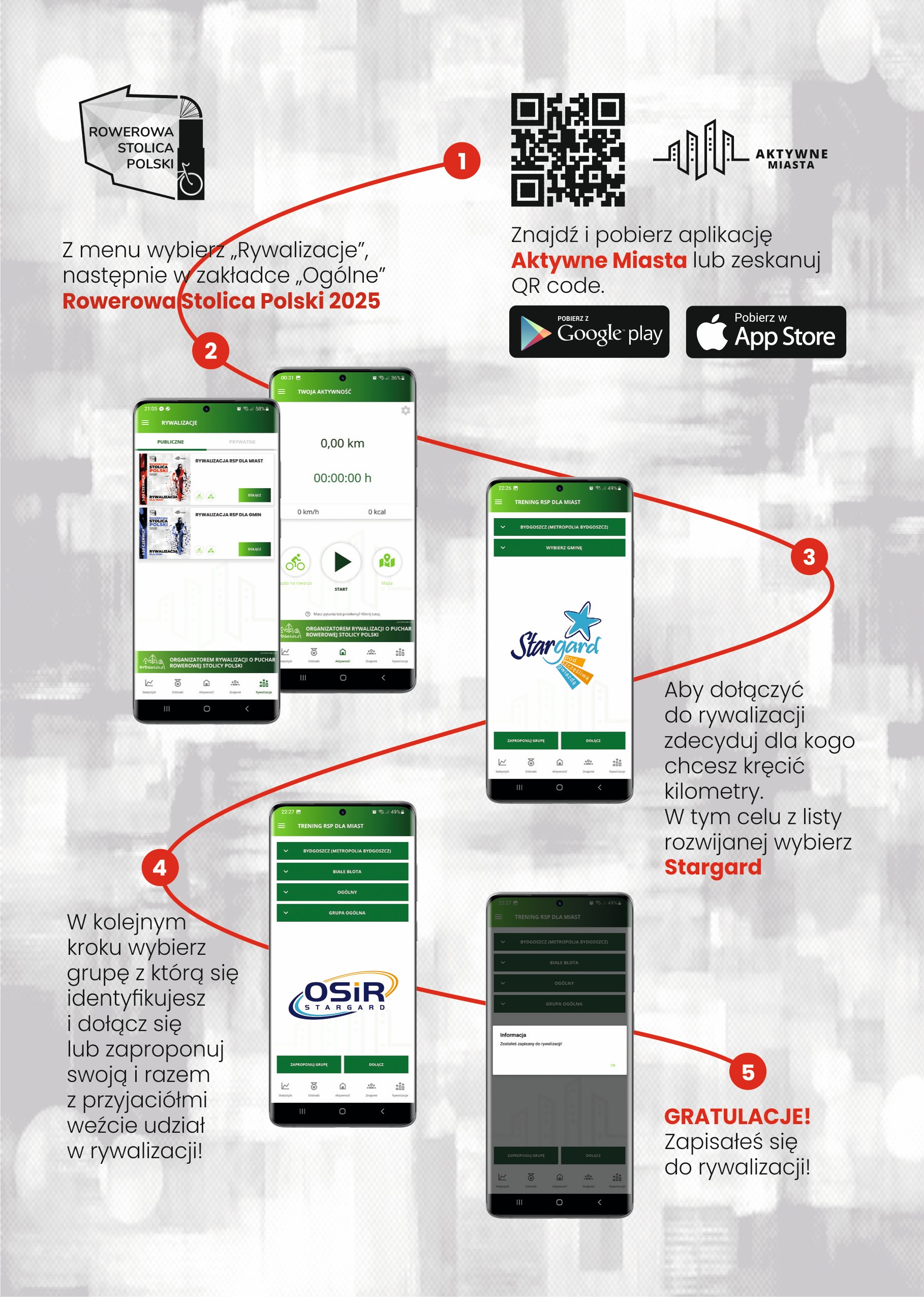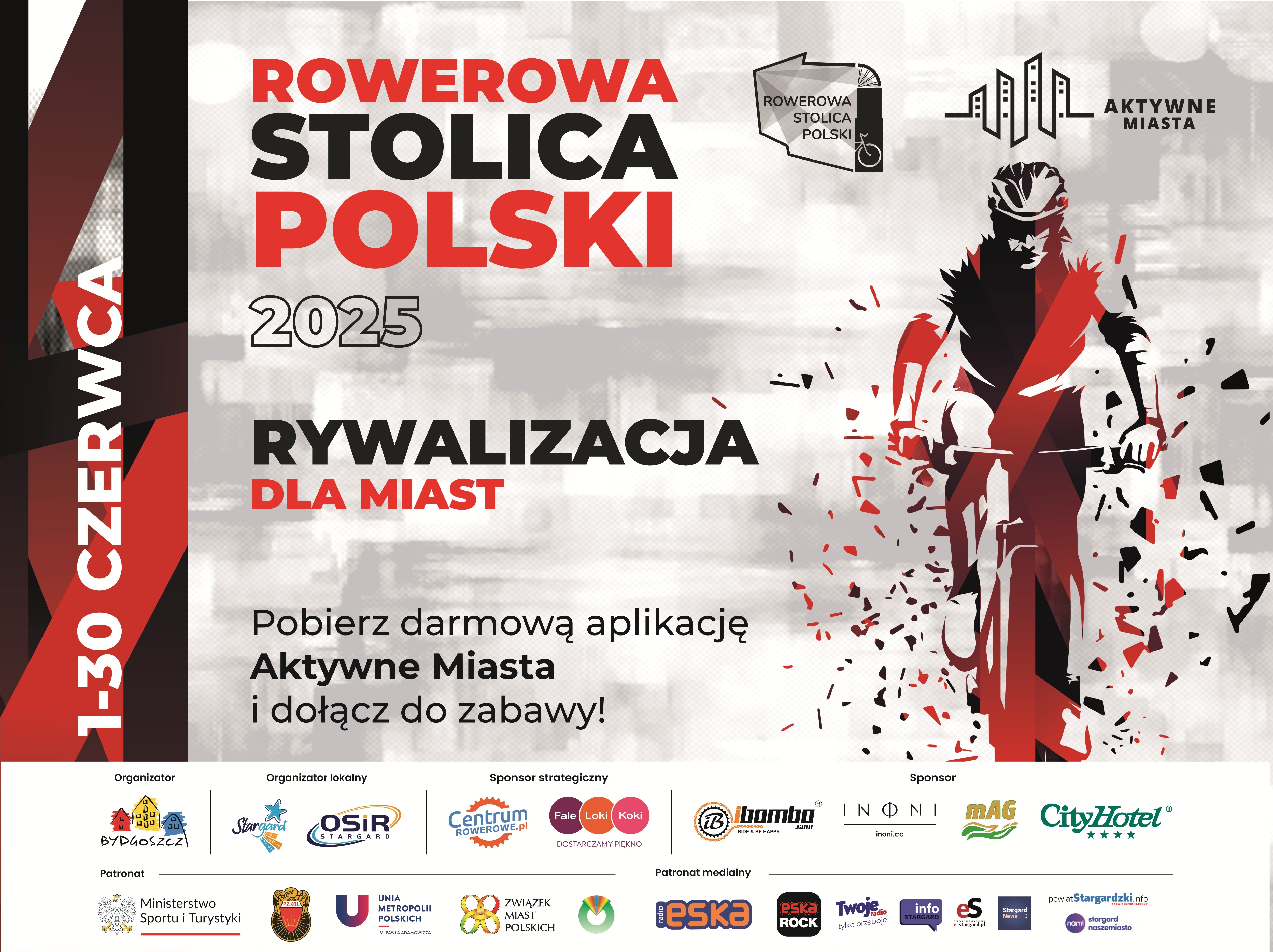 Co należy zrobić, aby wziąć udział w zabawie? Wystarczy ściągnąć aplikację „Aktywne Miasta” (sklep Google Play lub AppStore). Po zainstalowaniu wybieramy zakładkę Rywalizacje, a następnie Ogólne, gdzie znajdziemy zabawę Rowerowa Stolica Polski 2025. Dołączamy do rywalizacji, wskazując miasto, dla którego będziemy kręcić kilometry, a w następnym kroku wybierzemy dodatkowo grupę, z którą się identyfikujemy. Możemy też zaproponować swoją grupę, gdzie wraz z przyjaciółmi wspólnie będziemy mogli dokładać kolejne kilometry dla Stargardu.Nagrody dla najbardziej aktywnych