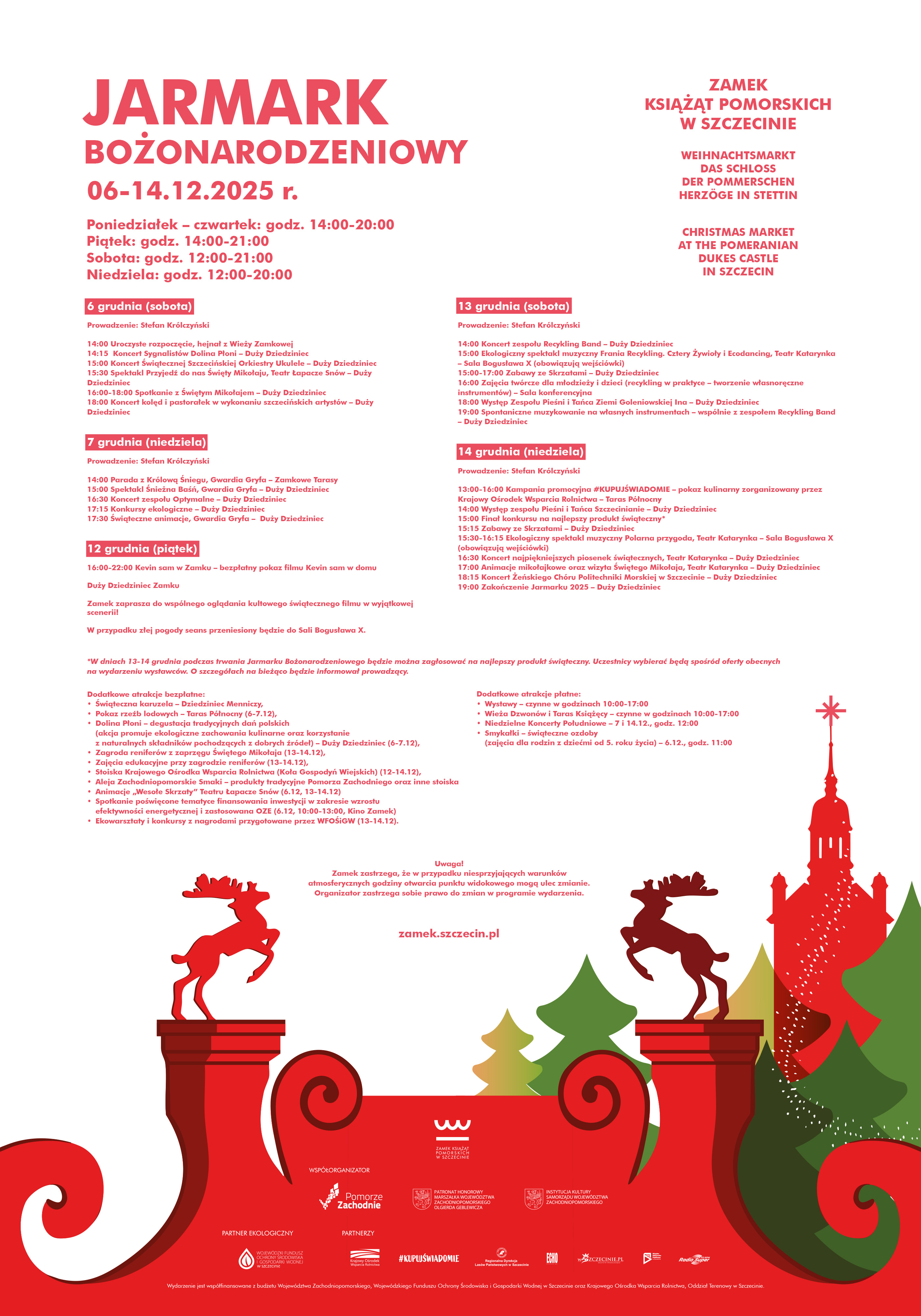 Jarmark Bożonarodzeniowy 2025 wypełnią brzmienia kolęd, zapach pierników i blask choinkowych świateł. Atrakcje obejmują m.in. paradę z Królową Śniegu, zagrodę reniferów czy pokazy lodowych rzeźb. Goście zobaczą także efektowny występ szczudlarzy z Gwardii Gryfa z Wrocławia, a najmłodsi będą mogli wziąć udział w zajęciach twórczych z tworzenia instrumentów z recyklingu. Na scenie pojawią się zespół Recykling Band – Finaliści V Edycji programu Mam Talent, Zespół Pieśni i Tańca Ziemi Goleniowskiej Ina, Zespół Szczecinianie, Chór Politechniki Morskiej w Szczecinie, a także Szczecińska Orkiestra Ukulele. Nie zabraknie też wydarzeń w środku – w Sali Księcia Bogusława X zaprezentowany zostanie spektakl muzyczny Teatru Katarynka z Warszawy.
