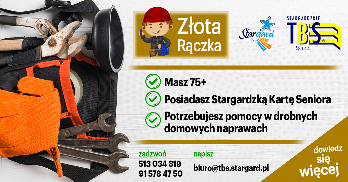 Po Złotą Rączkę można zadzwonić – tel. 513 034 819 lub 91 578 47 50 (w dni robocze, od poniedziałku do piątku 8:00-15:00) albo wysłać e-mail na adres: biuro@tbs.stargard.pl.