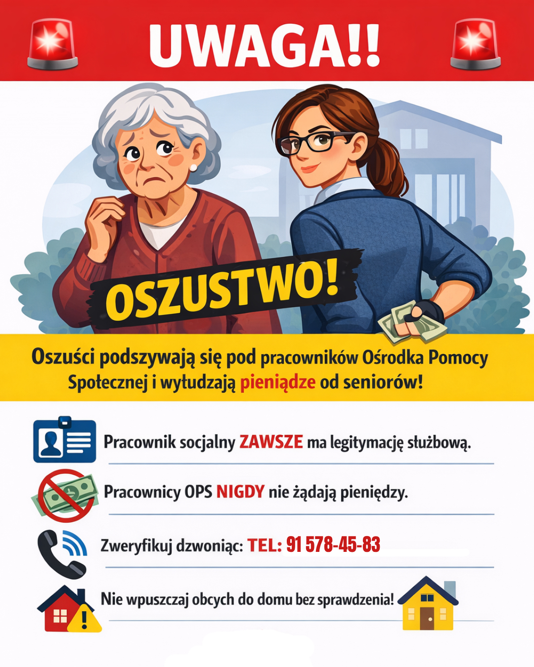 Prawdziwi pracownicy MOPS nigdy nie żądają pieniędzy za wizytę lub przyznanie pomocy. Zawsze mają również przy sobie służbową legitymację. Nie należy wpuszczać do domu obcych osób, dopóki nie upewnimy się, kim są. Jeśli podejrzewamy oszustwo, najlepiej jak najszybciej zgłosić sprawę na Policję – tel. 997 lub 112.