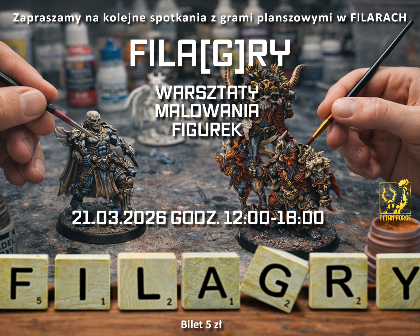 21.03 – FILA[G]RY & Titan Forge: To nie jest zwykłe granie! FILARY razem ze szczecińską ekipą TitanForge WARSZTATY MALOWANIA FIGUREK. Wybierasz swój model fantasy, poznajesz triki ekspertów i tworzysz własne dzieło sztuki. Do tego dziesiątki planszówek od Rebel.pl i IUVI Games oraz rabaty w sklepiku!