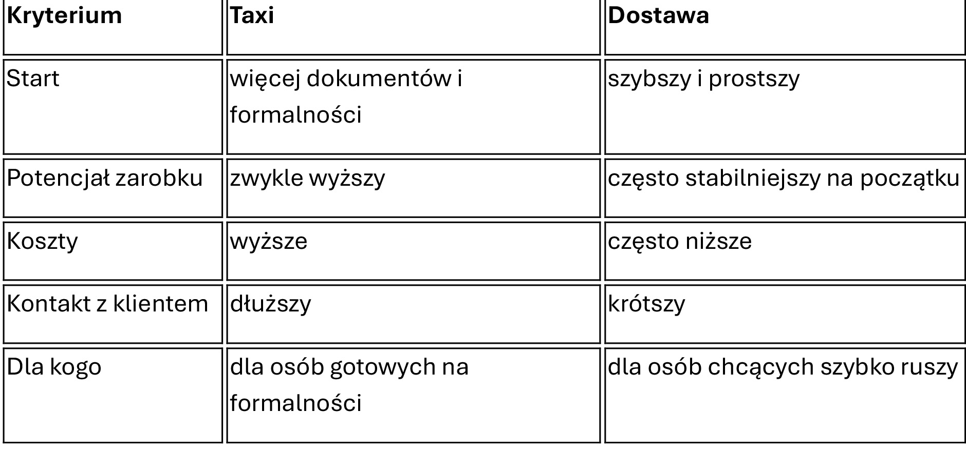 Z takiego porównania widać jasno, że taxi czy dostawa nie ma jednej odpowiedzi dla wszystkich. Jeśli liczy się prostota i szybkie wejście, mocniej wypada praca kurierem w Polsce. Jeśli celem jest większy potencjał dochodu i dłuższa perspektywa, lepiej może wypaść praca jako kierowca kategorii B.